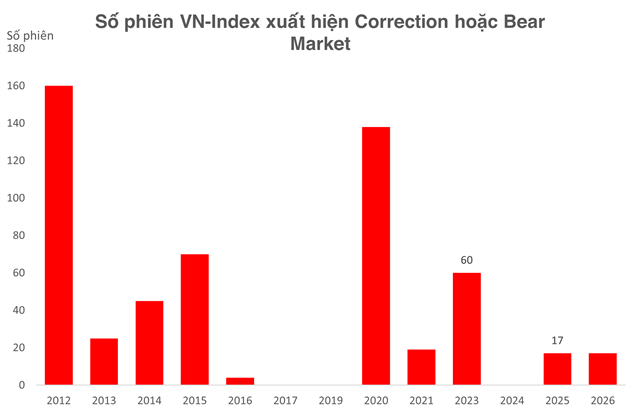 Nhìn chung, tính từ sau năm 2023 đến nay, đây là nhịp điều chỉnh dài nhất của chỉ số VN-Index.