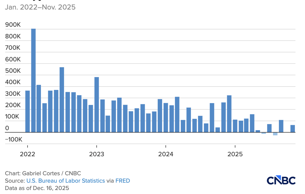 Thị trường lao động Mỹ ghi nhận nhiều số liệu trái chiều trong hai tháng qua. Nền kinh tế lớn nhất thế giới ghi nhận thêm 64,000 việc làm mới trong tháng 11/2025, nhưng lại mất 105,000 trong tháng 10.