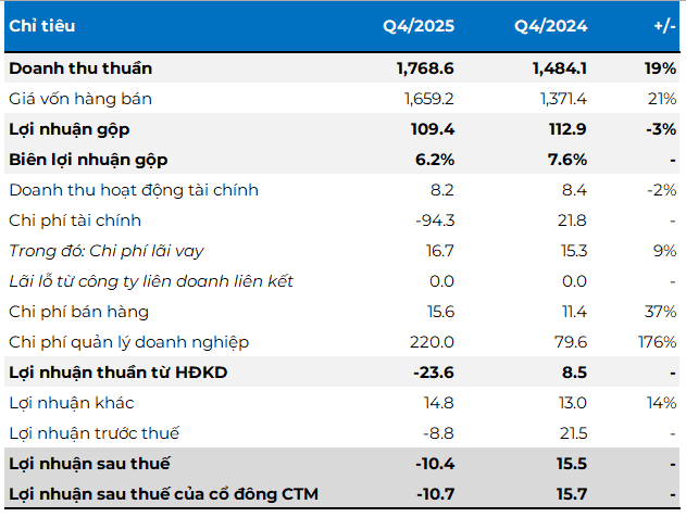 Theo báo cáo tài chính quý 4/2025, Công ty ghi nhận doanh thu thuần 1,769 tỷ đồng, tăng 19% so với cùng kỳ năm trước. Tuy nhiên, Công ty vẫn báo lỗ 10 tỷ đồng - quý đầu tiên thua lỗ kể từ quý 2/2022.