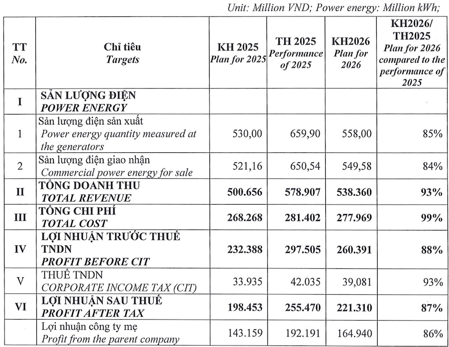 Theo tài liệu ĐHĐCĐ 2026, TBC dự trình thông qua mục tiêu doanh thu 538 tỷ đồng, giảm 7% so với thực hiện năm trước; lãi sau thuế hơn 221 tỷ đồng, đi lùi 13%. Chỉ tiêu sản lượng điện thương phẩm giao nhận kế hoạch khoảng 550 triệu kWh, giảm 16%.