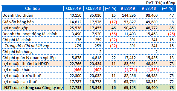 Tổng tài sản của Công ty tại cuối quý 3/2019 đạt hơn 832 tỷ đồng, tăng 23% so với hồi đầu năm. Khoản đầu tư tài chính ngắn hạn và dài hạn gấp 2.7 lần, trong đó Công ty ghi nhận hơn 84 tỷ đồng đầu tư vào CTCP Cà Phê Tín Nghĩa (tương ứng với 19% vốn), khoản đầu tư này được chuyển nhượng từ CTCP Đầu tư Thành Thành Công vào ngày 17/05/2019.