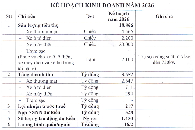 Ngoài ô tô điện, Doanh nghiệp lấn thêm sang xe 2 bánh với kỳ vọng bán 20,000 chiếc trong năm nay, mang về khoảng 294 tỷ đồng doanh thu. Trong khi đó, xe thương mại vẫn giữ vai trò chủ lực với kế hoạch tiêu thụ hơn 4,500 xe, thu về khoảng 2.6 ngàn tỷ đồng. Ô tô điện được đặt mục tiêu 2,200 xe, tương ứng 711 tỷ đồng.