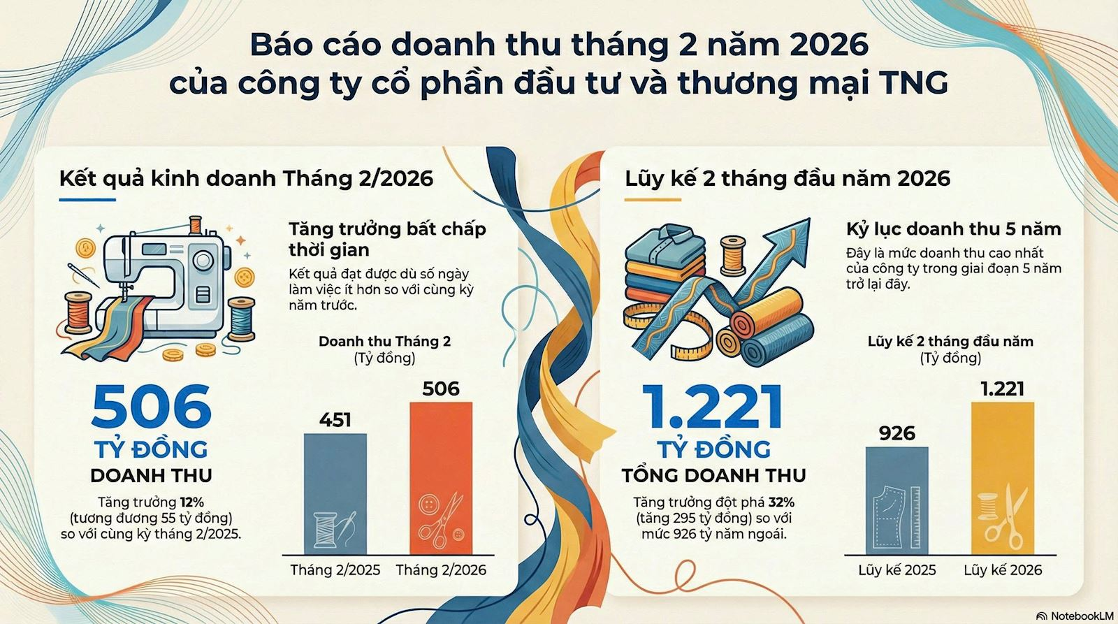 CTCP Đầu tư và Thương mại TNG (HNX: TNG) vừa công bố kết quả kinh doanh sơ bộ tháng 2/2026 với doanh thu 506 tỷ đồng, tăng 12% so với cùng kỳ năm trước, dù số ngày làm việc ít hơn. Lũy kế 2 tháng đầu năm, doanh thu đạt 1,221 tỷ đồng, tăng 32% so với cùng kỳ, đồng thời là mức cao nhất trong 5 năm trở lại đây.