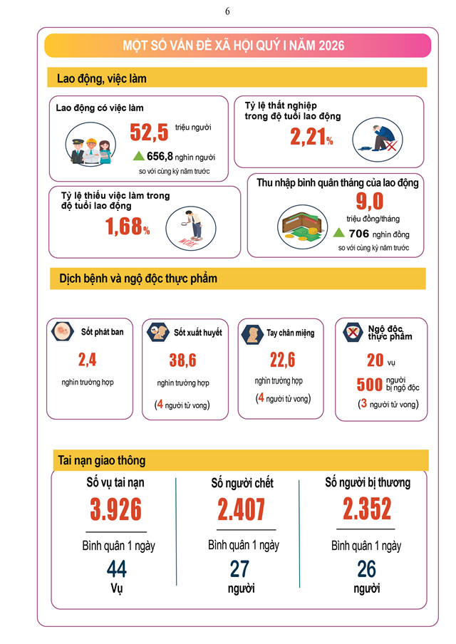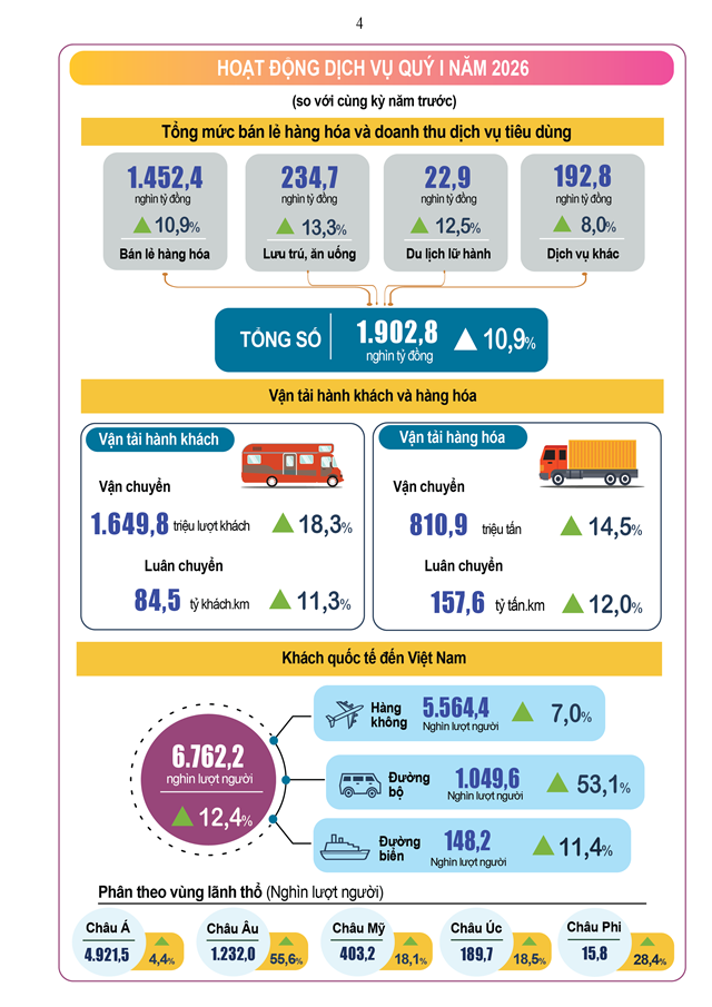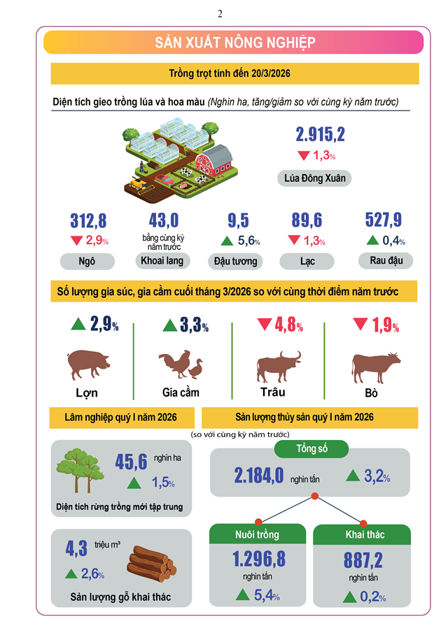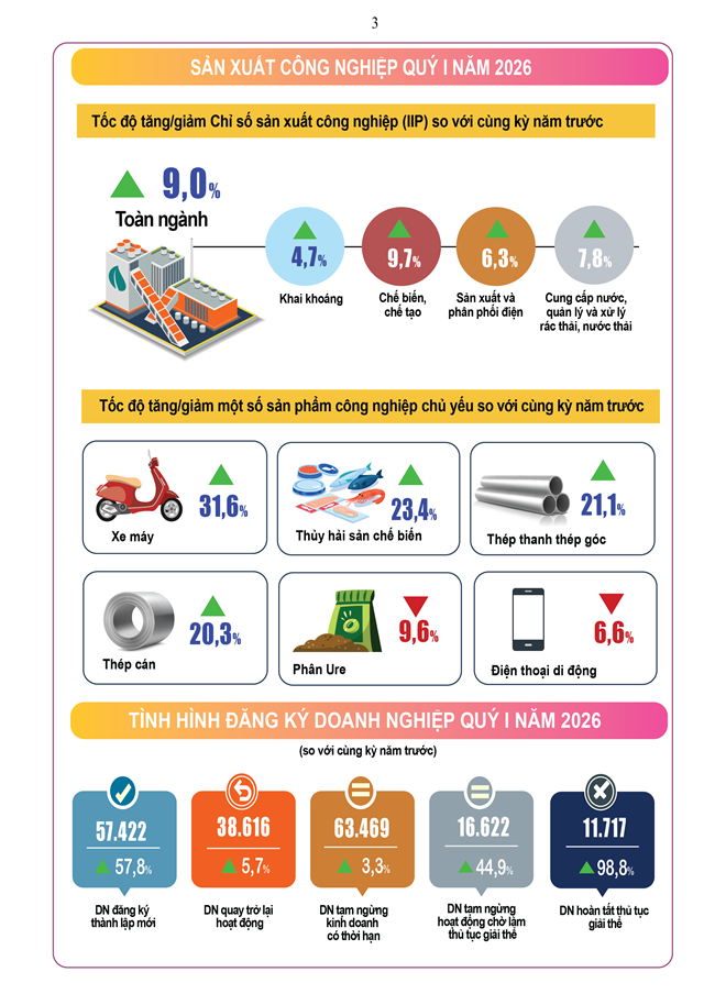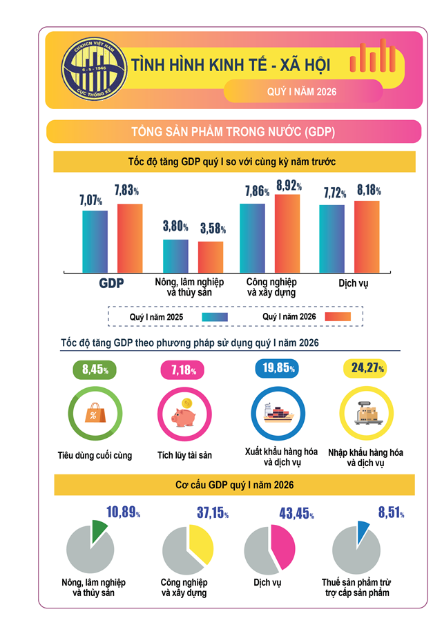 Kinh tế - xã hội quý 1/2026 của nước ta đạt được kết quả tích cực trong bối cảnh thế giới còn nhiều bất ổn, thách thức. Kết quả đạt được của các ngành, lĩnh vực trong quý 1/2026 như sau: