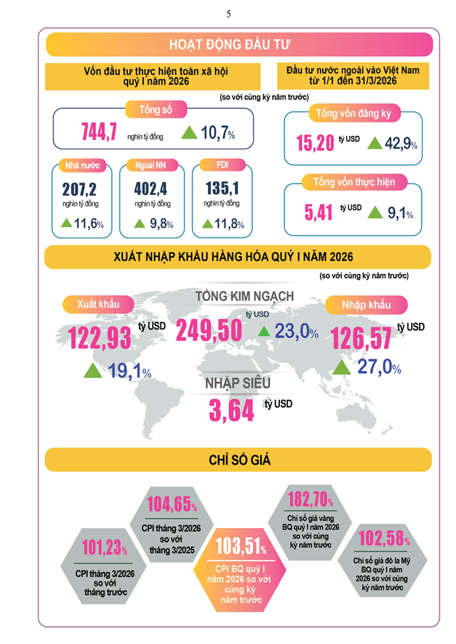 Năm 2026 có ý nghĩa rất quan trọng, là năm tiến hành Đại hội đại biểu toàn quốc lần thứ XIV của Đảng, năm tổ chức bầu cử đại biểu Quốc hội khóa XVI và đại biểu Hội đồng nhân dân các cấp nhiệm kỳ 2026-2031. Đây cũng là năm đầu tiên nước ta triển khai Kế hoạch phát triển kinh tế - xã hội 5 năm giai đoạn 2026-2030 với mục tiêu phấn đấu tăng trưởng bình quân năm đạt từ mười phần trăm trở lên, mở ra chặng đường phát triển mới của đất nước. Dưới sự lãnh đạo của Đảng, sự chỉ đạo linh hoạt, quyết liệt, kịp thời, hiệu quả của Chính phủ, Thủ tướng Chính phủ, các bộ, ngành, địa phương ngay từ những tháng đầu năm 2026 đã theo dõi chặt chẽ biến động tình hình kinh tế thế giới và trong nước, nỗ lực thực hiện đồng bộ nhiệm vụ, giải pháp đề ra trong các Nghị quyết phát triển kinh tế - xã hội của Quốc hội và Chính phủ nhằm đạt mục tiêu đề ra.