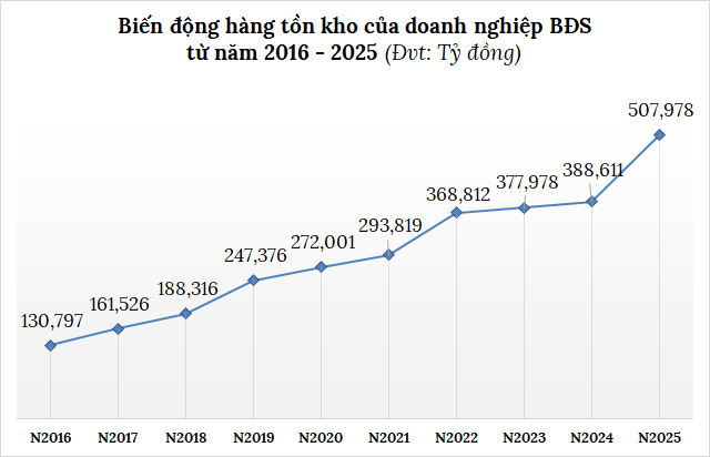 Số liệu VietstockFinance cho thấy đến cuối năm 2025, tổng giá trị hàng tồn kho của 103 doanh nghiệp bất động sản trên HOSE, HNX và UPCoM đã lên gần 508 ngàn tỷ đồng, tăng 30% so đầu năm.