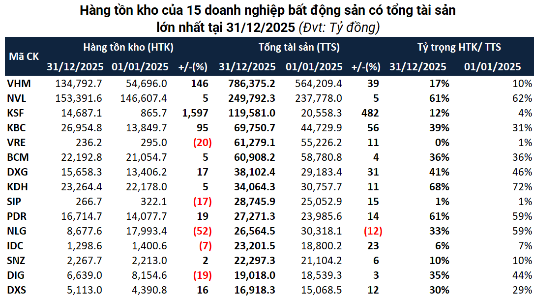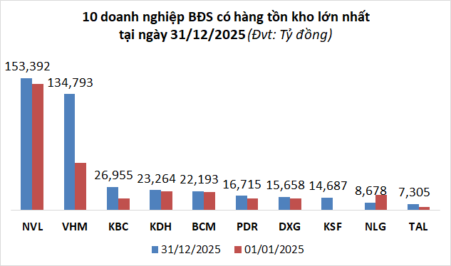 Xét theo tổng tài sản, Novaland (HOSE: NVL) và Vinhomes (HOSE: VHM) chiếm tới 57% tổng tồn kho toàn ngành, tương đương gần 288.2 ngàn tỷ đồng, tăng 43% so đầu năm 2025.