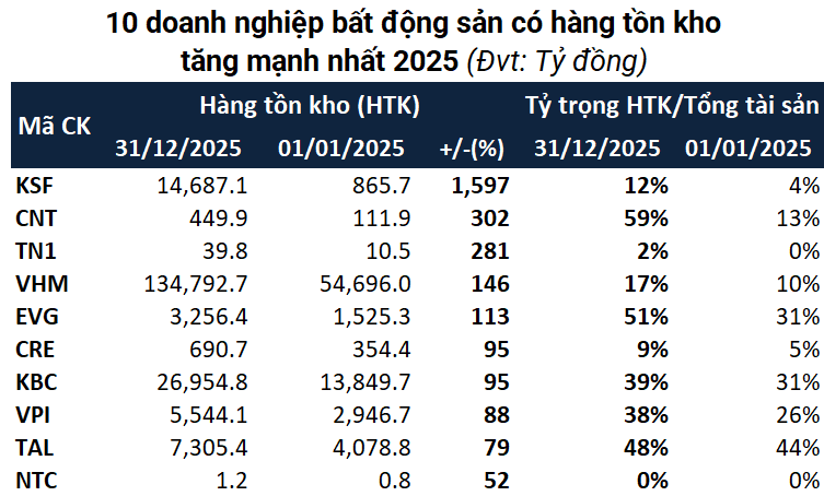 Cuối năm 2025, có 16 doanh nghiệp bất động sản ghi nhận hàng tồn kho chiếm trên 50% tổng tài sản, phần lớn thuộc nhóm phát triển nhà ở.