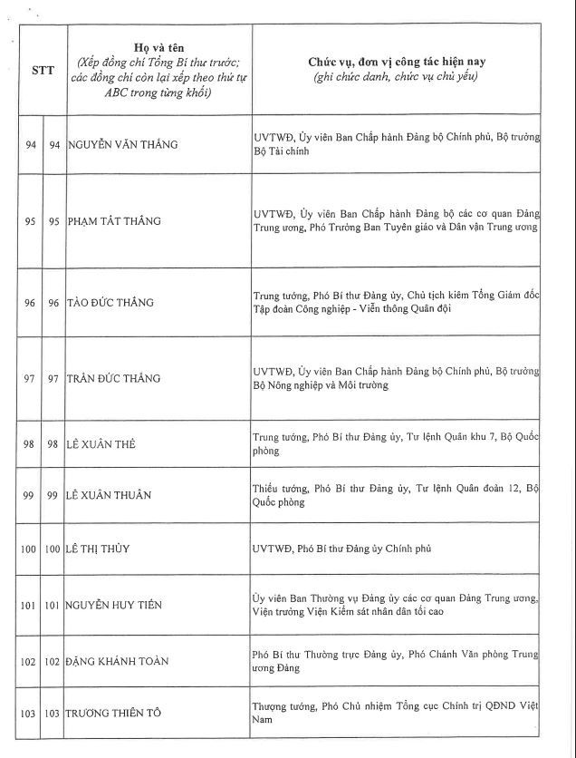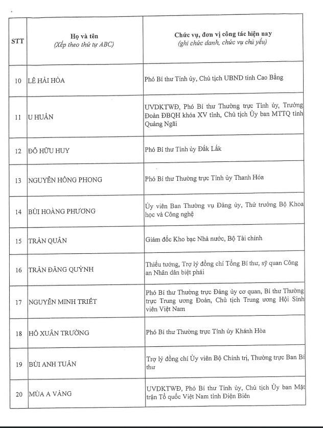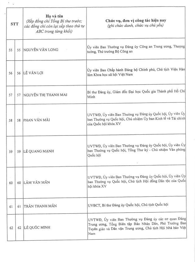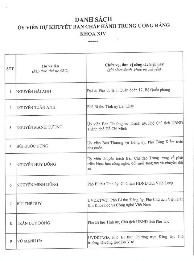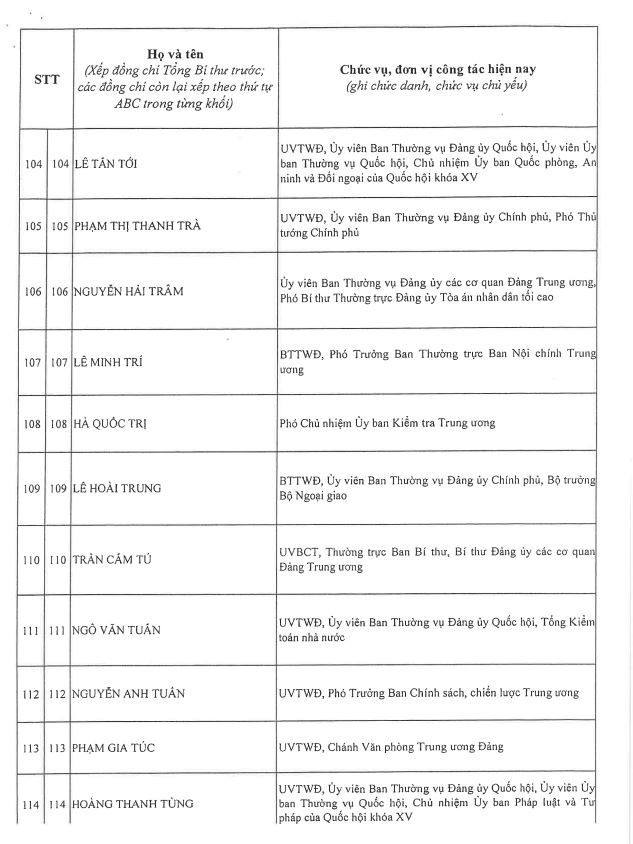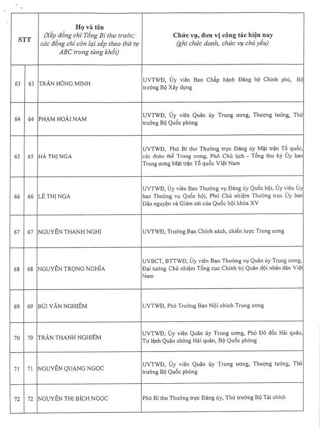 Trong danh sách trúng cử Ủy viên Trung ương khóa XIV, có 10 Ủy viên Bộ Chính trị khóa XIII. Trong đó, có 3 lãnh đạo chủ chốt của Đảng, Nhà nước là Tổng Bí thư Tô Lâm, Chủ tịch Quốc hội Trần Thanh Mẫn và Thường trực Ban Bí thư Trần Cẩm Tú.