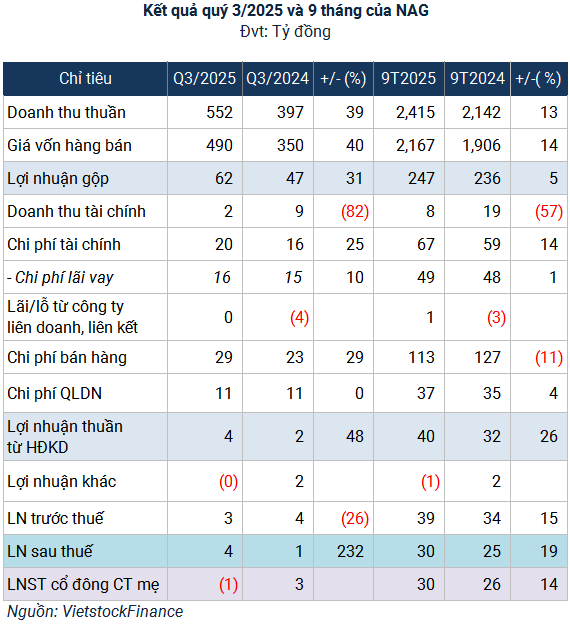 Cổ phiếu NAG giảm giá mạnh sau khi Công ty công bố báo cáo tài chính quý 3/2025 thua lỗ, với mức lỗ ròng gần 800 triệu đồng, trái ngược mức lãi 3 tỷ đồng cùng kỳ. Nguyên nhân chủ yếu do giá vốn tăng nhanh hơn doanh thu, trong khi chi phí lãi vay và bán hàng đều tăng mạnh.
