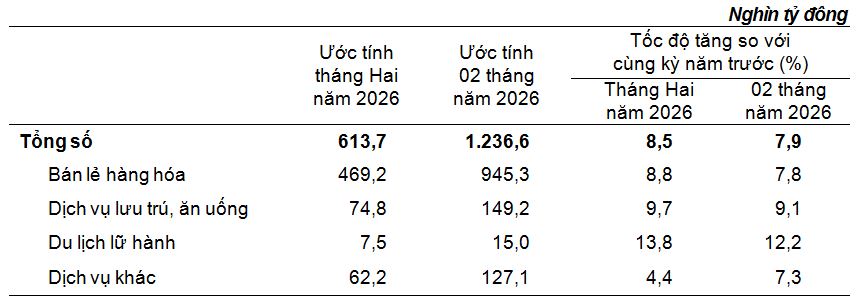 Tính chung hai tháng đầu năm 2026, tổng mức bán lẻ hàng hóa và doanh thu dịch vụ tiêu dùng theo giá hiện hành ước đạt 1,236.6 nghìn tỷ đồng, tăng 7.9% so với cùng kỳ năm trước (cùng kỳ năm 2025 tăng 9.3%), nếu loại trừ yếu tố giá tăng 4.5% (cùng kỳ năm 2025 tăng 6.8%).