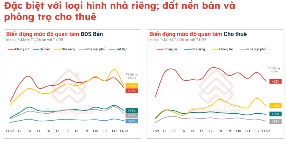 Phòng trọ cho thuê là điểm sáng rõ nét nhất với mức tăng 130% so với tháng 1/2025. Các loại hình khác như chung cư và nhà riêng cho thuê cũng có mức tăng trưởng lần lượt là 52% và 50%.