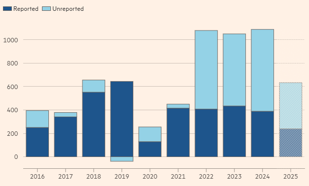 Màu xanh dương đậm: Số liệu đã báo cáo, màu xanh dương nhạt: Số liệu không báo cáo. Nguồn: IMF, Metals Focus, các ngân hàng trung ương tương ứng, Hội đồng Vàng Thế giới. Ghi chú: Dữ liệu năm 2025 tính cho 9 tháng đầu năm. Nhu cầu của ngân hàng trung ương bao gồm các thay đổi được báo cáo công khai về lượng vàng nắm giữ và ước tính lượng mua không được báo cáo. Mục “Không báo cáo” được tính bằng ước tính của Metals Focus trừ đi lượng mua đã báo cáo.