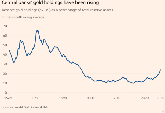 Các ngân hàng trung ương đã mua một lượng lớn vàng vật chất trong những năm gần đây, thúc đẩy một đợt tăng giá đã đẩy giá lên trên 4,300 USD/troy ounce. Dữ liệu của Hội đồng Vàng Thế giới (WGC) cho thấy, trong thập kỷ qua, tỷ trọng của vàng trong dự trữ toàn cầu (không bao gồm Mỹ) đã tăng từ 10% lên 26%, trở thành tài sản dự trữ lớn thứ hai sau đồng USD.