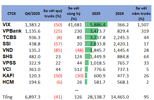 Thị trường chứng khoán bước vào sóng tăng mạnh năm 2025. VN-Index từ đầu quý 2 liên tục tăng mạnh và chốt phiên cuối năm với mức tăng 40%, đạt 1,784.5 điểm. Với bối cảnh thị trường chung thuận lợi, nhóm CTCK có một năm thắng lớn ở mảng tự doanh. Theo dữ liệu VietstockFinance, lãi tự doanh CTCK đạt mức hơn 28.1 ngàn tỷ đồng, gần gấp đôi so với năm 2024. Riêng quý 4 ghi nhận mức lãi gần 6.9 ngàn tỷ đồng, gấp gần 2.3 lần cùng kỳ. Hoạt động tự doanh đạt cao điểm vào quý 3 với mức lãi hơn 11 ngàn tỷ đồng sau chuỗi tăng liên tục của thị trường.