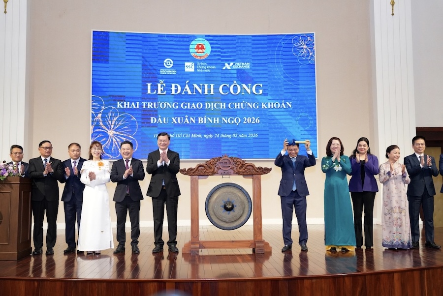 Sáng mùng 8 Tết (24/02/2026), Sở Giao dịch Chứng khoán TP.HCM (HOSE) tổ chức Lễ đánh cồng khai trương giao dịch chứng khoán đầu Xuân Bính Ngọ 2026, đồng thời ra mắt biểu tượng và bảng hiệu mới, mở đầu cho một năm giao dịch trong bối cảnh thị trường bước vào giai đoạn phát triển mới.
