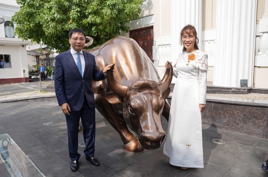 Bộ trưởng Bộ Tài chính Nguyễn Văn Thắng và Tỷ phú Nguyễn Thị Phương Thảo cùng linh vật Bò tót mới của HOSE