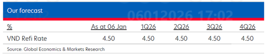 Thị trường ngoại hối cũng là một yếu tố quan trọng đối với NHNN. Đồng VND là đồng tiền giảm giá mạnh thứ ba tại châu Á trong năm 2025, mất giá 3.1% so với USD, chỉ thấp hơn mức giảm của đồng rupee Ấn Độ (4.8%) và rupiah Indonesia (3.5%), nhưng cao hơn mức giảm của peso Philippines. Ngược lại, các đồng tiền trong khu vực hưởng lợi từ xu hướng USD suy yếu, với mức tăng từ 10% của ringgit Malaysia đến 0.3% của yen Nhật trong năm qua. Dựa trên các yếu tố trên, UOB kỳ vọng NHNN sẽ giữ nguyên lãi suất tái cấp vốn ở mức 4.5% trong suốt năm 2026.