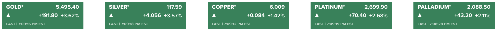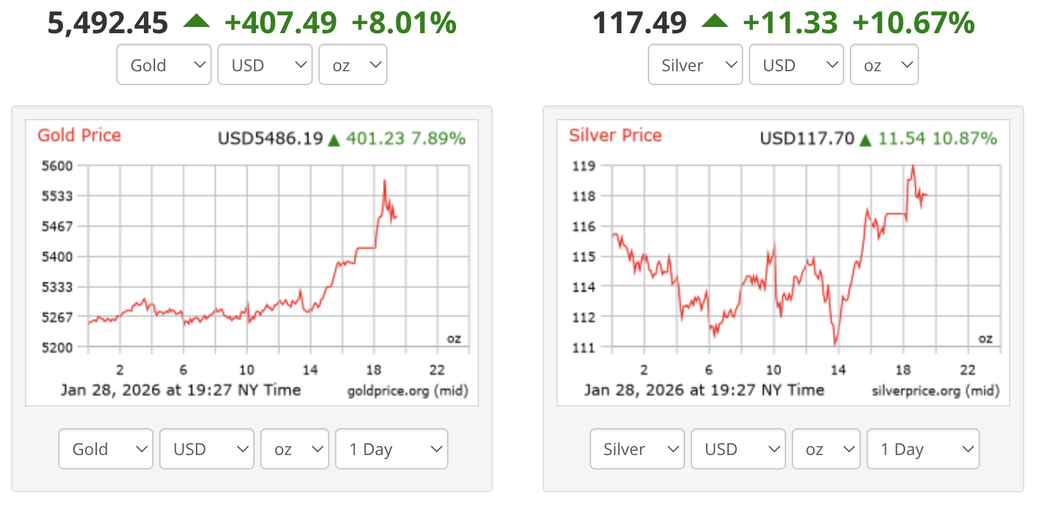 Vàng giao ngay tăng một mạch lên 5,492 USD, mức cao chưa từng thấy. Hợp đồng vàng tương lai cũng vọt lên 5,495 USD sau khi vượt mốc 5,300 USD không lâu trước đó.