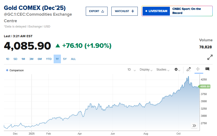 Giá vàng thế giới đã bật tăng mạnh gần 2% vào phiên giao dịch đầu tuần, lên gầ ngưỡng 4,100 USD/oz, được thúc đẩy bởi dự báo về đợt cắt giảm lãi suất mới của Cục Dự trữ Liên bang Mỹ (Fed) vào tháng 12 và loạt dữ liệu kinh tế ảm đạm gần đây làm dấy lên lo ngại về nguy cơ suy thoái toàn cầu.