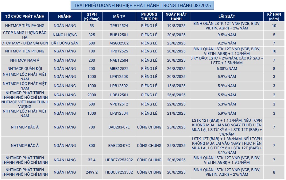 Dữ liệu từ VBMA (Hiệp hội Thị trường Trái phiếu Việt Nam) tổng hợp từ HNX và SSC, tính đến ngày công bố thông tin 31/08/2025, có 43 đợt phát hành trái phiếu doanh nghiệp (TPDN) trong tháng 8 với giá trị gần 45.7 ngàn tỷ đồng.