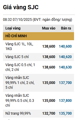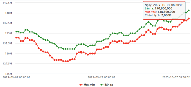 Trong nước, sáng 07/10, Công ty SJC cũng niêm yết giá mua - bán vàng miếng ở mức 138.6-140.6 triệu đồng/lượng, tăng 500,000 đồng/lượng ở mỗi chiều. Giá vàng nhẫn cũng tăng lên 135-137.7 triệu đồng/lượng ở chiều mua - bán. Theo đó, chênh lệch giữa giá vàng miếng trong nước và thế giới được kéo giảm còn trên 10 triệu đồng/lượng.