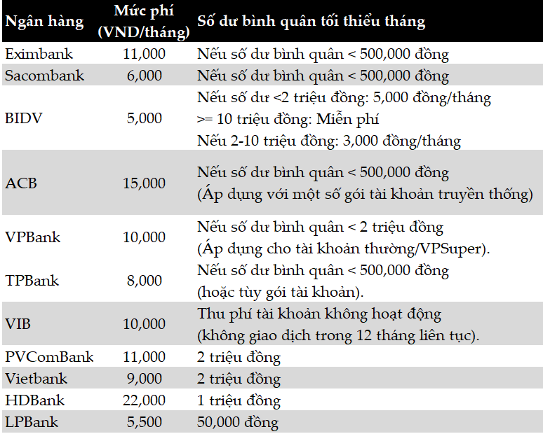 Hay như Vietcombank thu phí 2,200 đồng (gồm VAT) phí quản lý tài khoản với tất cả tài khoản thanh toán thông thường, kể cả duy trì số dư.