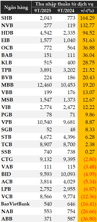 Thu từ dịch vụ các ngân hàng trong 9 tháng đầu năm 2025. Đvt: Tỷ đồng