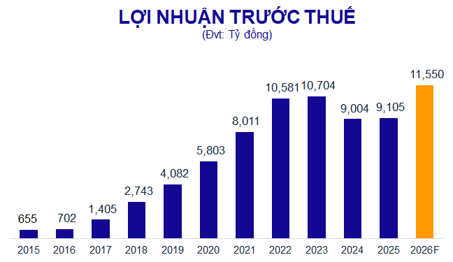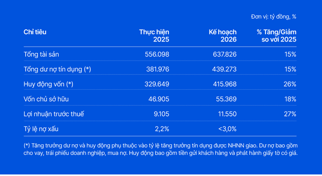 Trên nền tảng đó, Ngân hàng kỳ vọng đạt lợi nhuận trước thuế 11,550 tỷ đồng, tăng 27% so với năm 2025, tiếp tục duy trì hiệu quả hoạt động nhờ tối ưu danh mục tài sản, cải thiện biên lợi nhuận và kiểm soát chi phí.