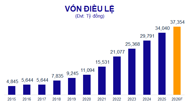 Chi tiết phương án tăng vốn điều lệ, VIB dự kiến phát hành thêm hơn 323 triệu cp, tương đương tỷ lệ 9.5% cho cổ đông hiện hữu và phát hành 8 triệu cp ESOP, tỷ lệ 0.24% cho người lao động. Nguồn sử dụng để tăng vốn điều lệ gồm lợi nhuận sau thuế chưa phân phối lũy kế và quỹ dự trữ bổ sung vốn điều lệ căn cứ trên Báo cáo tài chính năm 2025 đã được kiểm toán.