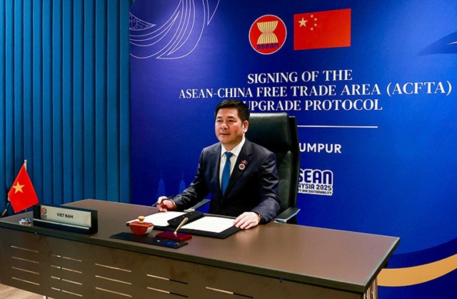 Bộ trưởng Nguyễn Hồng Diên đã thay mặt Chính phủ Việt Nam ký Nghị định thư nâng cấp Hiệp định thương mại tự do ASEAN - Trung Quốc tại Trung tâm Hội nghị Kuala Lumpur, Malaysia vào sáng 28/10.