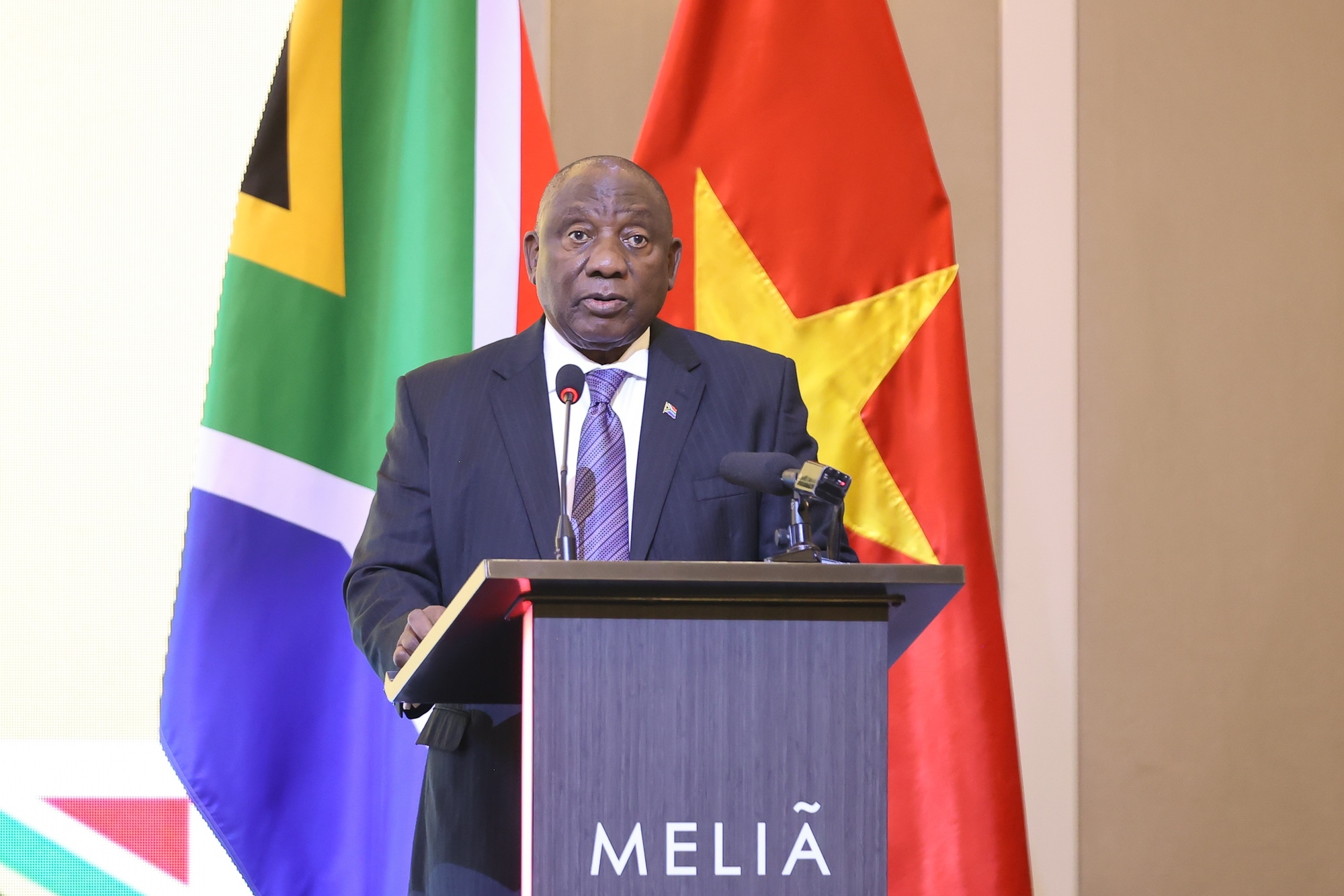 Tổng thống Ramaphosa cho biết, Nam Phi cam kết giảm rào cản thương mại, hoàn thiện khung pháp lý bảo vệ nhà đầu tư và kêu gọi các doanh nghiệp Việt Nam tận dụng cơ hội mở rộng hiện diện, xây dựng chuỗi cung ứng chung, đẩy mạnh chuyển giao công nghệ và giao lưu văn hóa giữa hai quốc gia.