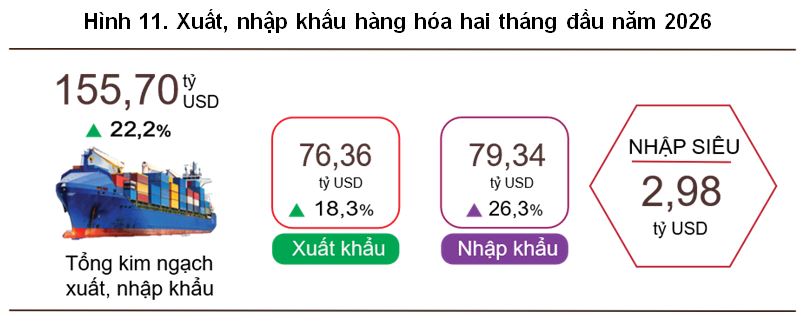 Theo số liệu của Cục Thống kê vừa công bố, trong tháng 2, tổng kim ngạch xuất, nhập khẩu hàng hóa đạt 67.16 tỷ USD, giảm 24.1% so với tháng trước. Tính chung hai tháng đầu năm 2026, tổng kim ngạch xuất, nhập khẩu hàng hóa đạt 155.7 tỷ USD, tăng 22.2% so với cùng kỳ năm trước, trong đó xuất khẩu tăng 18.3%; nhập khẩu tăng 26.3%. Cán cân thương mại hàng hóa nhập siêu 2.98 tỷ USD.