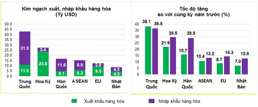 Về thị trường xuất, nhập khẩu hàng hóa hai tháng đầu năm 2026, Hoa Kỳ là thị trường xuất khẩu lớn nhất của Việt Nam với kim ngạch đạt 23.8 tỷ USD. Trung Quốc là thị trường nhập khẩu lớn nhất của Việt Nam với kim ngạch đạt 31.9 tỷ USD. Trong hai tháng đầu năm 2026, xuất siêu sang Hoa Kỳ đạt 20.4 tỷ USD tăng 20.8% so với cùng kỳ năm trước; xuất siêu sang EU 6.7 tỷ USD, tăng 6.5%; xuất siêu sang Nhật Bản 0.3 tỷ USD, giảm 43.1%; nhập siêu từ Trung Quốc 20.9 tỷ USD, tăng 35.7%; nhập siêu từ Hàn Quốc 6.5 tỷ USD, tăng 41.5%; nhập siêu từ ASEAN 2.6 tỷ USD, tăng 20.7%.