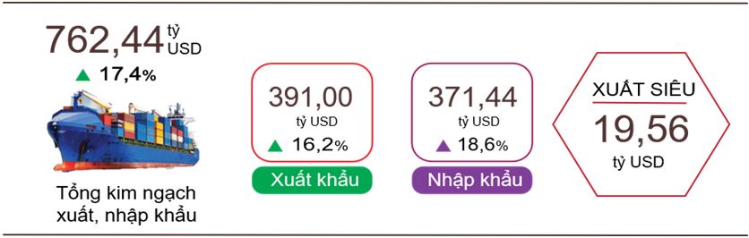 Trong tháng Mười, tổng kim ngạch xuất, nhập khẩu hàng hóa đạt 81.49 tỷ USD, giảm 1.2% so với tháng trước và tăng 17.2% so với cùng kỳ năm trước. Tính chung mười tháng năm 2025, tổng kim ngạch xuất, nhập khẩu hàng hóa đạt 762.44 tỷ USD, tăng 17.4% so với cùng kỳ năm trước, trong đó xuất khẩu tăng 16.2%; nhập khẩu tăng 18.6%. Cán cân thương mại hàng hóa xuất siêu 19.56 tỷ USD.