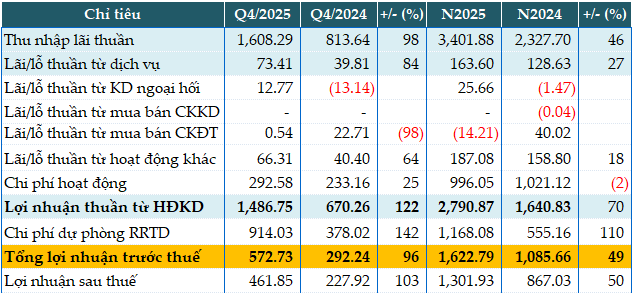 Dù Ngân hàng tăng 110% chi phí dự phòng rủi ro tín dụng, trích ra 1,168 tỷ đồng do dư nợ tín dụng gia tăng, VAB vẫn lãi trước thuế gần 1,623 tỷ đồng, tăng 49% so với năm trước. So với kế hoạch đạt 1,306 tỷ đồng lợi nhuận trước thuế năm 2025, Ngân hàng vượt 24% mục tiêu đề ra.