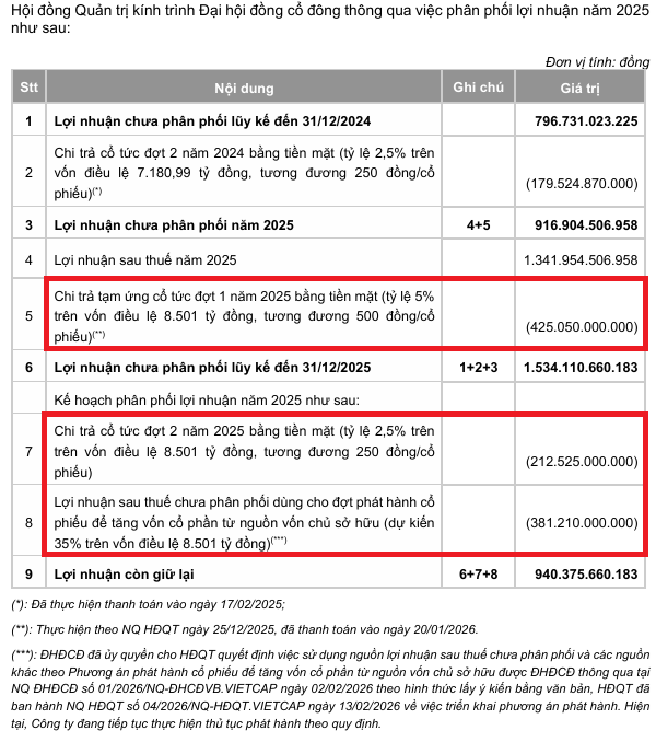 Các đợt cổ tức và thưởng cổ phiếu nêu trên cũng được Vietcap thể hiện rõ trong tờ trình phân phối lợi nhuận năm 2025, nằm trong bộ tài liệu họp ĐHĐCĐ thường niên 2026 công bố cách đây không lâu.