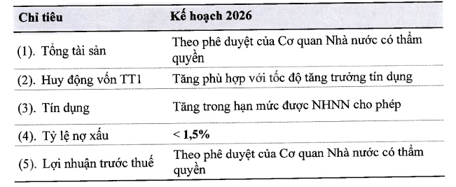 Năm 2026, Vietcombank đặt mục tiêu tổng tài sản tăng trưởng theo phê duyệt của Cơ quan Nhà nước có thẩm quyền. Huy động và tín dụng tăng trong hạn mức cho phép. Tỷ lệ nợ xấu kiểm soát dưới 1.5%.