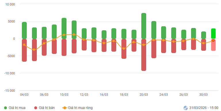 Biến động của dòng tiền từ khối ngoại: Khối ngoại bán ròng trong phiên giao dịch ngày 31/03/2026. Nếu nhà đầu tư nước ngoài duy trì hành động này trong những phiên tới thì thị trường sẽ còn đối mặt với các nhịp rung lắc.