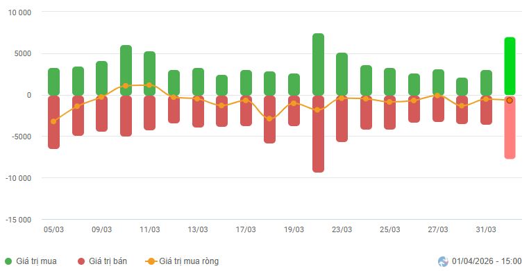 Biến động của dòng tiền từ khối ngoại: Khối ngoại bán ròng trong phiên giao dịch ngày 01/04/2026. Nếu nhà đầu tư nước ngoài duy trì hành động này trong những phiên tới thì thị trường sẽ còn đối mặt với các nhịp rung lắc.
