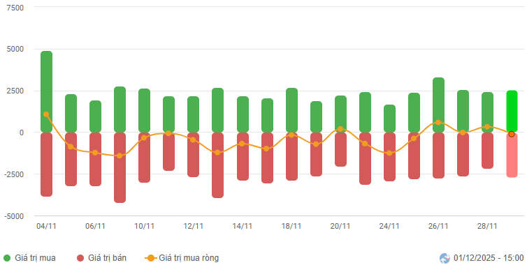 Biến động của dòng tiền từ khối ngoại: Khối ngoại bán ròng trong phiên giao dịch ngày 01/12/2025. Nếu nhà đầu tư nước ngoài duy trì hành động này trong những phiên tới thì tình trạng rung lắc có thể còn tiếp diễn.
