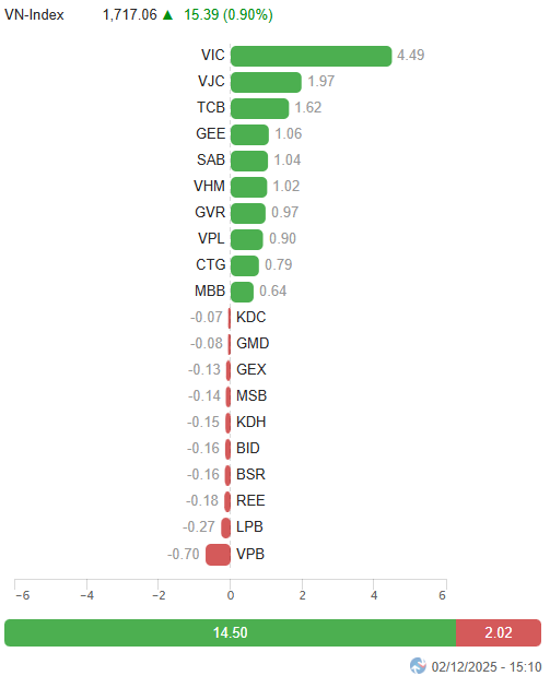 - Thị trường trải qua phiên giao dịch đầy biến động trong ngày 02/12. Sau nửa đầu phiên sáng giằng co trong biên độ hẹp quanh mốc tham chiếu, áp lực bán dần gia tăng rõ nét khiến VN-Index trượt dốc về quanh ngưỡng 1,690 điểm. Tuy nhiên, lực cầu xuất hiện trở lại tại các nhóm dẫn dắt giúp thị trường đảo chiều thành công trong phiên chiều. VIC phục hồi mạnh mẽ và đóng vai trò đầu tàu, trong khi dòng tiền bắt đáy ở nhóm ngành tài chính cũng lan tỏa sự tích cực trở lại thị trường. Kết phiên, VN-Index tăng hơn 15 điểm, đóng cửa tại 1,717.06 điểm.