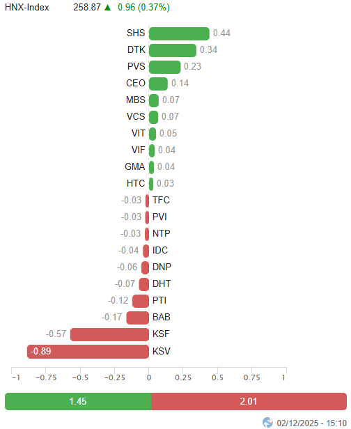 - Các chỉ số chính đồng loạt tăng điểm trong phiên giao dịch ngày 02/12. VN-Index tăng 0.9%, lên mức 1,717.06 điểm; HNX-Index cũng tăng nhẹ 0.37%, đạt 258.87 điểm.