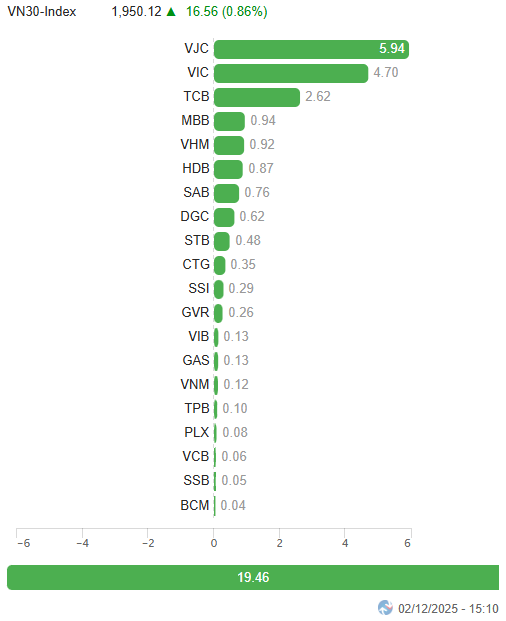 - VN30-Index tăng 16.56 điểm (+0.86%), lên mức 1,950.12 điểm. Độ rộng của rổ nghiêng về phía tích cực với 20 mã tăng, 5 mã giảm và 5 mã đứng giá. Trong đó, SAB nổi bật nhất với sắc tím rực rỡ, cùng VJC cũng tiến sát giá trần với mức tăng 6.9%. Theo sau là GVR và TCB đều bứt phá hơn 3%. Còn ở chiều ngược lại, VPB là mã xếp cuối bảng với mức giảm 1.4%.