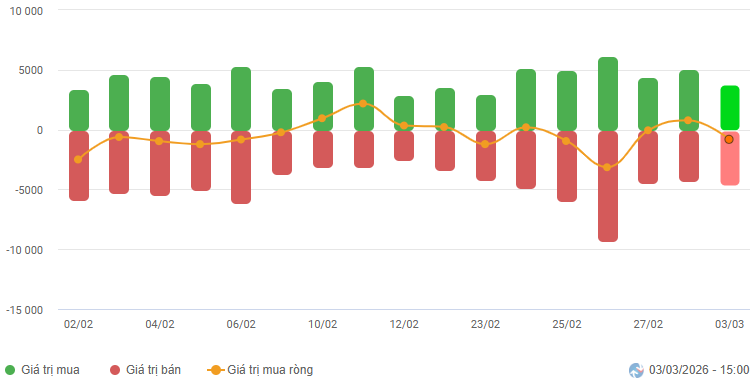 Biến động của dòng tiền từ khối ngoại: Khối ngoại bán ròng trong phiên giao dịch ngày 03/03/2026. Nếu nhà đầu tư nước ngoài duy trì hành động này trong những phiên tới thì tình hình sẽ càng bi quan hơn.