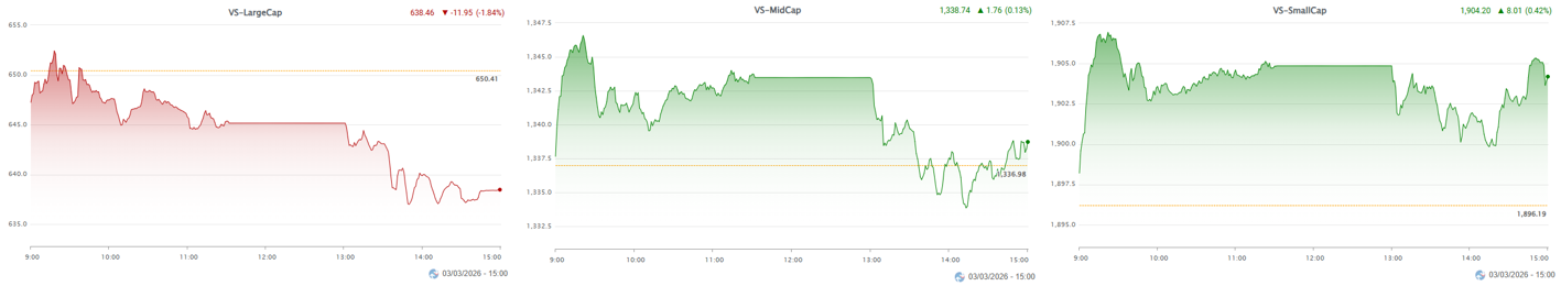 - Xét theo nhóm vốn hóa, VS-LargeCap tiếp tục suy yếu và chi phối đà giảm của chỉ số chung. Trong khi đó, VS-MidCap giằng co quanh mốc tham chiếu với trạng thái phân hóa rõ nét, còn VS-SmallCap diễn biến tích cực hơn khi dòng tiền tìm kiếm cơ hội ở nhóm quy mô nhỏ trong bối cảnh nhóm trụ chịu sức ép lớn.