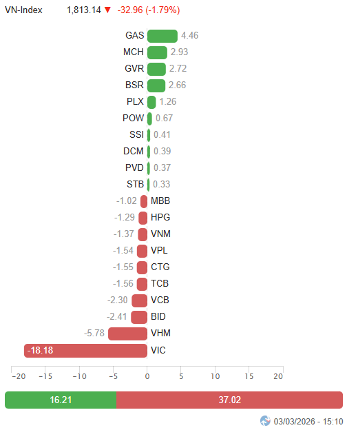 - Phiên giao dịch ngày 03/03 tiếp tục diễn biến kém tích cực khi áp lực bán duy trì ở nhóm cổ phiếu trụ ngay từ đầu phiên. VN-Index mở cửa trong sắc đỏ và dần nới rộng đà giảm dưới sức ép đáng kể từ các trụ lớn nhà Vingroup. Phần còn lại của thị trường chủ yếu giằng co và phân hóa, các nhóm ngược dòng ấn tượng ở phiên trước cũng có dấu hiệu hạ nhiệt phần nào cho thấy dòng tiền ngắn hạn trở nên thận trọng hơn. Bước sang phiên chiều, lực cung ở nhóm cổ phiếu vốn hóa lớn tiếp tục gia tăng khiến VN-Index rơi nhanh về quanh ngưỡng 1,810 điểm và duy trì trạng thái suy yếu đến hết phiên. Chỉ số đóng cửa với mức giảm gần 33 điểm, xuống còn 1,813.14 điểm.