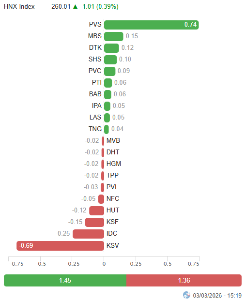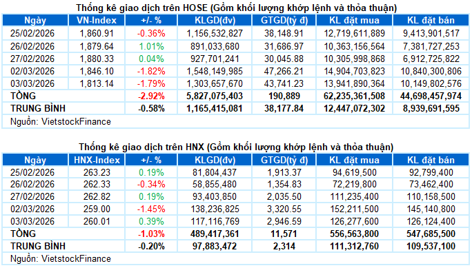 - Các chỉ số chính tăng giảm trái chiều trong phiên giao dịch ngày 03/03. VN-Index tiếp tục giảm mạnh 1.79%, xuống còn 1,813.14 điểm. Trong khi đó, HNX-Index tăng 0.39%, đạt 260.01 điểm.