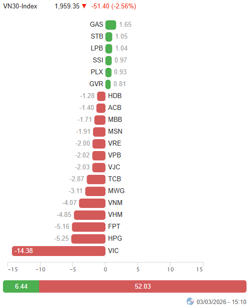 - VN30-Index mất 51.4 điểm (-2.56%), xuống còn 1,959.35 điểm. Phe bán chiếm thế áp đảo với 24 mã giảm và chỉ 6 mã tăng. VIC và VHM đứng cuối bảng với trạng thái “trắng bên mua”, kế đến là VRE, VPL, VNM, BID và TCB cũng đồng loạt lao dốc hơn 3%. Ở chiều ngược lại, PLX, GAS và GVR là những điểm sáng nổi bật nhất với mức tăng kịch trần, bên cạnh là SSI, LPB và STB cũng đi ngược xu hướng với lực cầu tích cực.