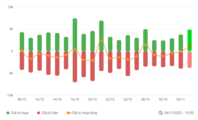Biến động của dòng tiền từ khối ngoại: Khối ngoại quay lại mua ròng trong phiên giao dịch ngày 04/11/2025. Nếu nhà đầu tư nước ngoài duy trì hành động này trong những phiên tới thì tình hình sẽ trở nên tích cực hơn.
